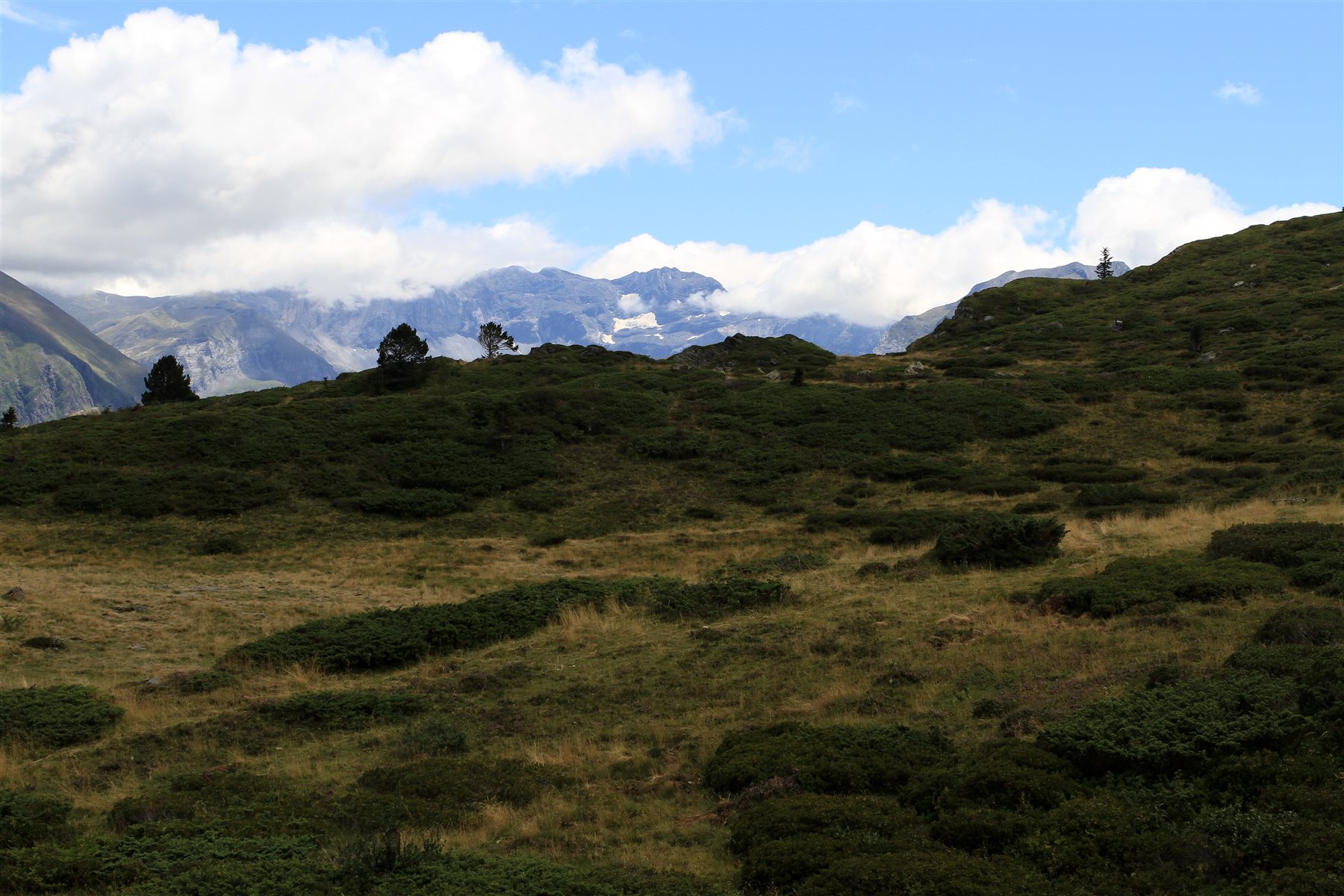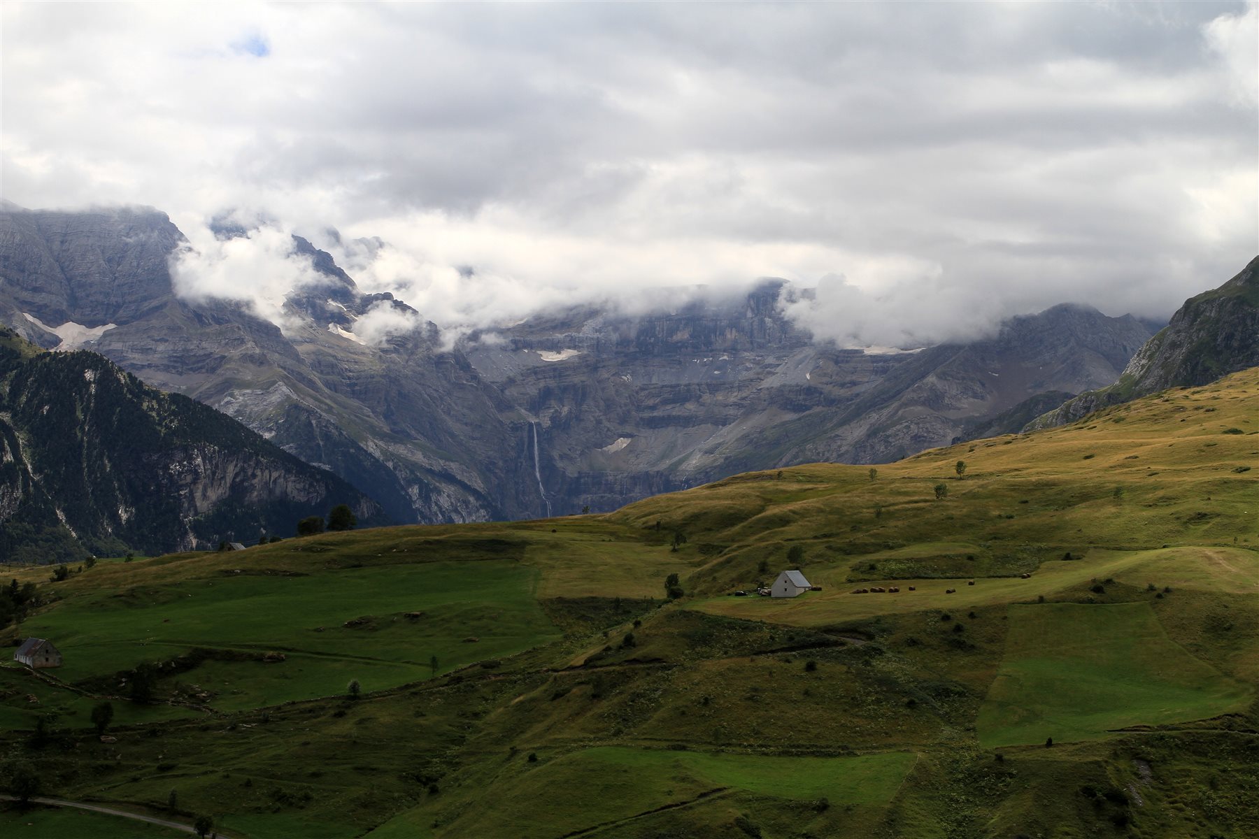 Au niveau de Pragnière et de son usine edf, on quitte la route principale pour amorcer un long crochet passant par les granges de Bué. Un peu plus loin, on pourrait avoir une belle vue sur le cirque de Gavarnie mais là c'est bouché par les nuages. De plus, il y a une ligne haute tension qui gâche un peu le paysage...