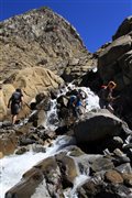 C'est à ce niveau que nous bifurquons vers la voie des échelles. Il n'y a en fait aucune échelle, c'est juste un passage bien raide où il faut mettre les mains. Et il n'y a d'ailleurs plus grand monde ! Ca monte, ça monte fort même, le tout sous un soleil de plomb. Mais nous sommes récompensés par la vue sur le cirque et sa cascade.