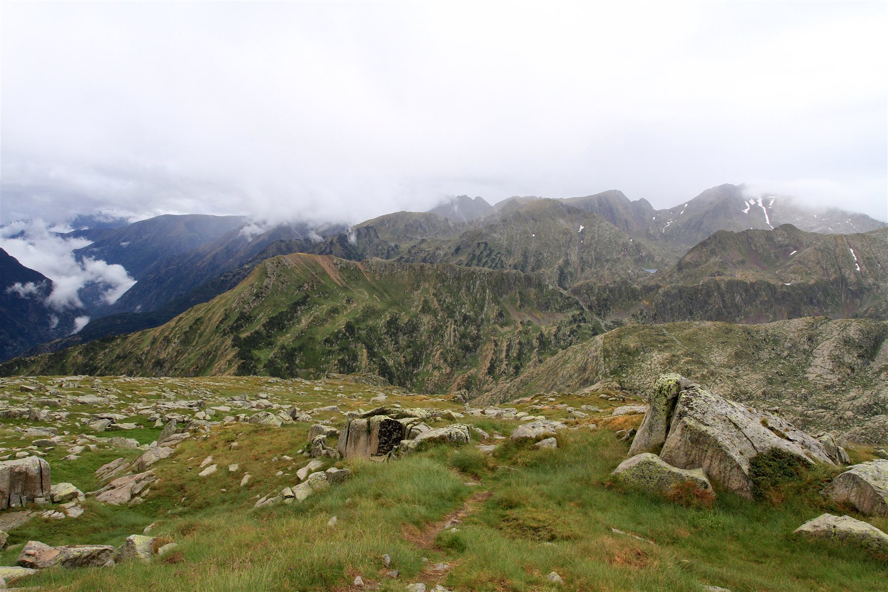 La montée est bien longue et la fin du col est plus difficile techniquement : des gros blocs à nouveau. Point de vue terrain les GRT arriegois sur lesquels nous évoluons n'ont rien à voir avec le GR10 que l'on prendra plus tard ! Une vraie réussite je trouve ces GRT :) On croise quelques rares personnes (qui sont sur la HRP) venant de Certascan. Il y a de plus en plus de petites averses... c'est pas bon signe. Au bout de 5h on atteint enfin le col. De l'autre côté, la météo n'est pas meilleure...