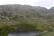 La descente est plus facile que la fin de la montée, mais le temps se gâte de plus en plus. On voit bien que ce serait joli sinon... On finit par grignoter rapidement un bout "abrité" par un caillou avant de repartir vers le lac Romedo de Baix au niveau duquel on trouve un bel abri (genre abri bus) sous lequel on aurait pu manger au sec !!! Du coup on prend un dessert en regardant la pluie tomber. Car là, oui, il pleut bien ! Ce qui implique que le terrain est bien glissant et que les passages un peu plus délicats (comme juste après l'abri) sont chiants à passer...