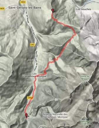 Réveil 7h00 pour un petit déjeuner à 7h30. On part du gîte à 8h00. On descend jusqu'à la télécabine du Prarion que l'on prend pour monter là où on s'était arrêté la veille. On y est à 8h30. Le ciel est bien dégagé (il fait d'ailleurs déjà bien chaud) et la vue sur les glaciers du Mont Blanc est toujours aussi belle. On redescend vers le col de Voza, qui est plus calme ce matin, puis on continue en longeant plus ou moins la ligne du Tramway du Mont Blanc. Direction le col de Tricot. On laisse donc le GR classique filer sur notre droite.