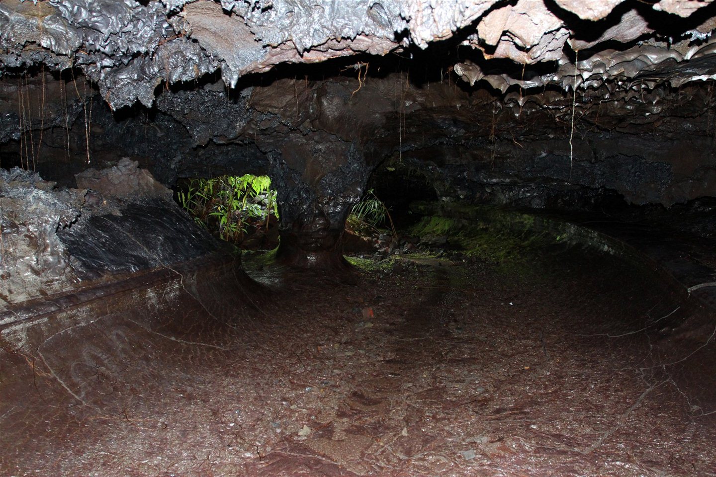 On décide alors d'aller jusqu'aux coulées de lave du Volcan. On se gare à côté de la coulée 2001. Pascal sait qu'il y a un tunnel de lave, mais il ne sait pas où exactement. On commence à descendre sur la coulée et au bout de quelques minutes je repère un trou. C'est bien ça ! l'entrée du tunnel. On s'y aventure sur quelques dizaines de mètres, mais guère plus étant donné que nous ne sommes pas équipés pour ça. Il aurait fallu casque, lampes puissantes, fil d'ariane etc. Cependant, l'aperçu que nous en avons nous donne une bonne idée du tunnel. L'ambiance est assez irréelle. Il y a des "tunnels" dans le tunnel, différentes strates de lave, et de la végétation qui commence à pousser : on voit les racines de ces plantes pendre au plafond. Il fait noir, il fait chaud et surtout c'est très humide !