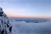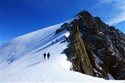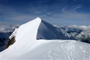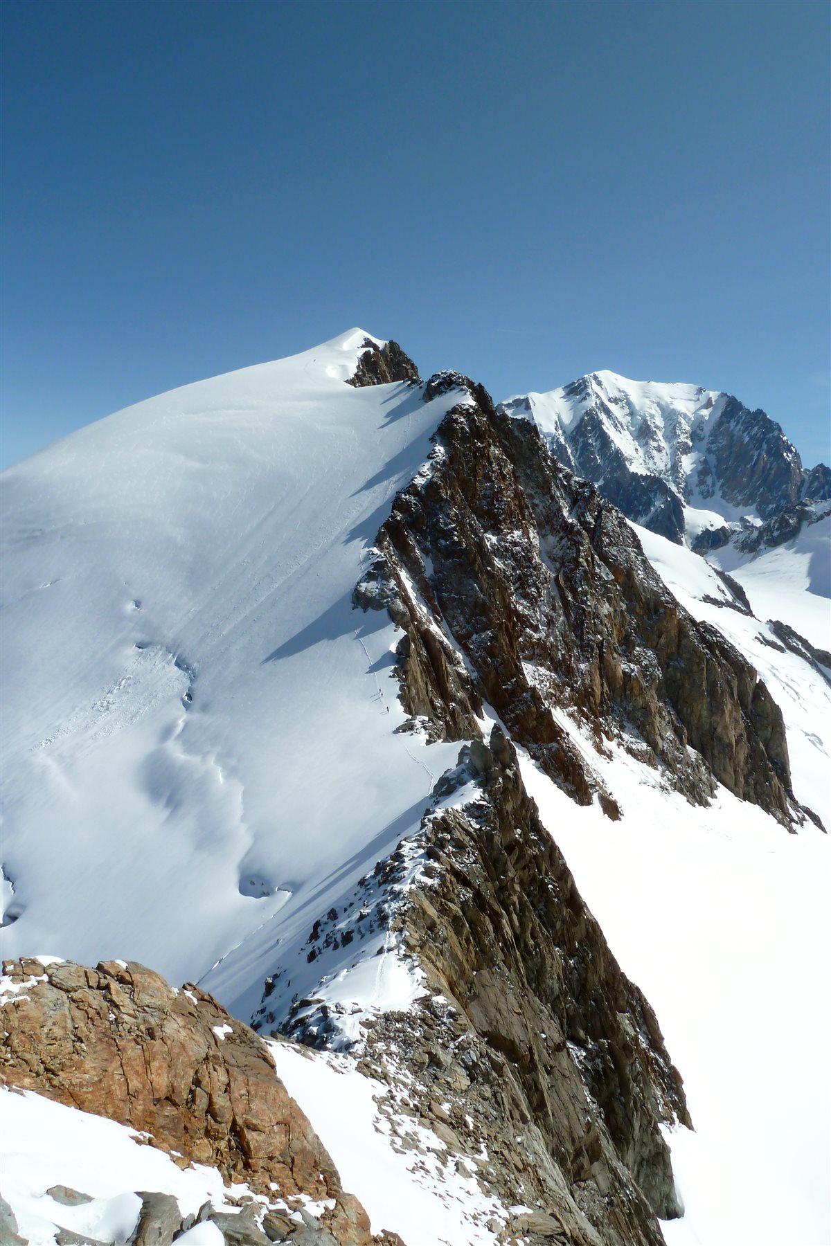 Dimanche 24 août : Le temps s'est couvert dès samedi après-midi et ce matin il neige et il fait bien froid à cause d'un vent soutenu. On décide de retarder un peu le départ en espérant que le vent se calme. La principale difficulté est la montée au premier dôme. Terrain mixte mais en l'occurence il y a pas mal de neige. Après un passage un peu délicat, tout s'enchaine un peu plus vite. Et une fois les deux premiers dômes passés on attaque la partie facile en neige au delà du col des dômes. Facile mais il faut rester vigilent... Pas le droit à la chute ! Le vent s'est calmé, le soleil brille de tout feu, c'est magique ! On fini la traversée par l'aiguille de la Bérangère, avant de redescendre (par une voie connue seulement par les guides de Saint Gervais) directement sur le refuge de Tré la Tête où l'on prend le repas avant de redescendre en vallée.