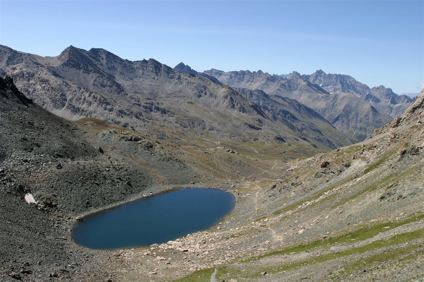 Lundi 14 août 2006 : Saint Véran (2040 m) - Chianale (Italie) (1800 m)(+800 / -1200) - Première journée complète et le beau temps est de la partie. Afin de passer par un itinéraire encore plus joli, nous prenons la navette qui nous mème sur les hauteurs de Saint-Véran (vers 2200 m). Au lieu de passer par le col Blanchet, nous faisons un crochet par le col de la noire (2955 m) et sa "sympathique montée" dans un petit vent à moins de 8 degrès puis le lac de la noire, le col Longet, le lac bleu avant de redescendre vers Chianale où les Italiens faisaient la fête et nous ont proposé un coup de rouge ! Des paysages magnifiques pour cette étape. Un grand merci à Bertrand d'avoir emprunté cet itinéraire.