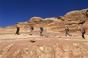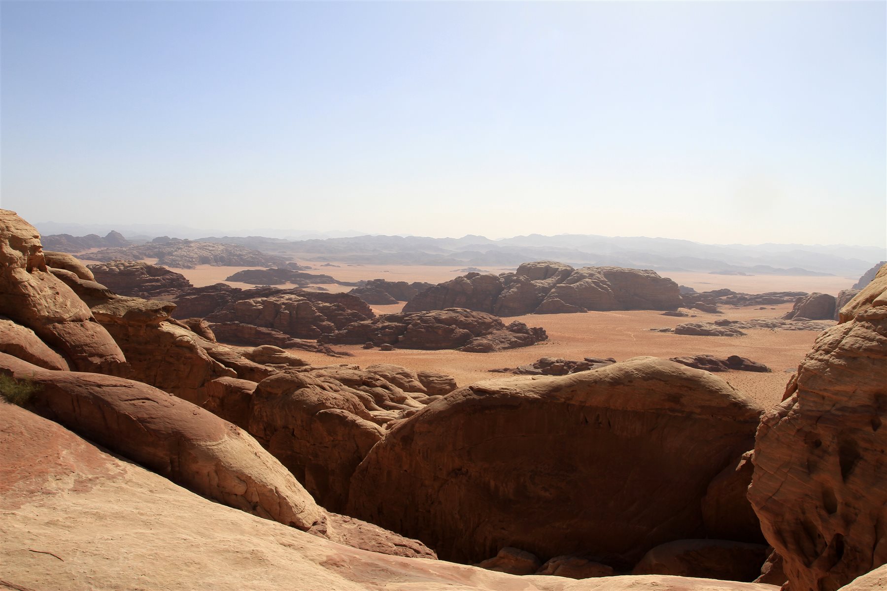Après la belle introduction de la veille, nous poursuivons notre trek en commençant par l'ascension du Rad el Salem, depuis lequel nous avons une vue à 360° sur l'ensemble du Wadi Rum. L'Arabie Saoudite se dresse un peu plus au sud, alors que nous, nous remontons vers le nord, vers les sables rouges.