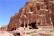 La journée est entièrement consacrée à la découverte de Pétra. Contrairement à tous les autres visiteurs qui arrivent par l'entrée principale et le fameux siq, nous arrivons par le sud, par la montagne. En quelques minutes nous sommes au Snake Monument, puis nous descendons vers l'ancienne ville de Pétra. Cette partie de Pétra est encore habitée par les bédouins : il y a de nombreux caveaux, de nombreuses grottes. Parfois de simple trous, parfois des facades gravées dans la montagne.