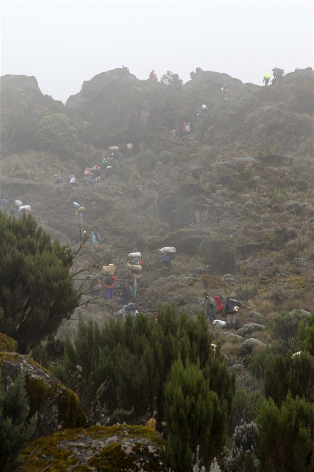 Le départ est donné vers 8h. La montée vers Shira Camp est plus raide que la veille. Le "chemin" est étroit et les nombreux porteurs qui nous doublent nous obligent à nous arrêter régulièrement. Les nuages remontent rapidement depuis la plaine et vers 9h le ciel est déjà couvert. La pluie ne tarde pas à faire son entrée... Capes, goretex sont de sortie...